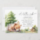 Adorable baby shower invitations with a forest theme. A watercolor scene of a sleepy baby bear frames your event details. Default text reads: "A little cub is on the way!". The reverse side features a pattern of nature elements such as leaves, acorns and berries.