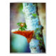 A painting of a pair of pixie sized green dragons on a mushroom that has grown on a tree. One little dragon sleeps whilst the other keeps guard.