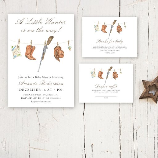 A Little Hunter is on the way! Watercolor hunter themed. Hunting rifle on a string, map, hat, boots, pacifier.