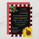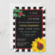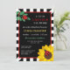 A little ladybug is on the way! Cute ladybug-themed baby shower invitation with a frame of black and white stripes, a red border, and two ladybugs. One ladybug sits on a sunflower and the other sits on green leaves.