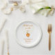 Paper plates for a baby shower with a peach theme. The item says "A little peach is on the way". The design includes a smiling, cartoon, peach and a scribbled heart. Customise the words, add this to your cart, and have a wonderful baby shower.