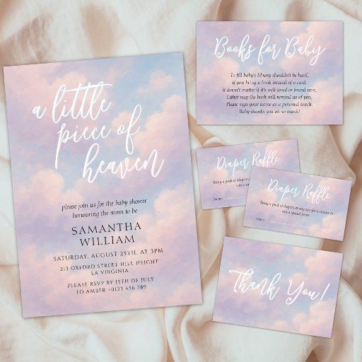 This design features baby shower theme "A LITTLE PIECE OF HEAVEN" with beautiful cloud background in shades of pastel blue and pastel pink. Perfect for a Cloud Nine baby shower or Heaven Sent baby shower. This product can be easily personalised. If you need help with the customisation of the product or need matching products kindly please contact me via Zazzle.