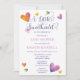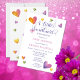 Script text "A Little Sweetheart" with serif fonts "Is On Her Way" precious watercolor hearts design Baby Shower invitation with purple and pink text. Perfect for celebrating the pending arrival of your sweet little one! Composite design by Holiday Hearts Designs (rights reserved).