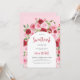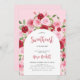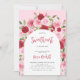 Celebrate the mom-to-be with this girly baby shower invitation featuring a floral arch with pink and red flowers and elegant script font.