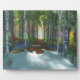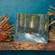 A forest walk through the seasons, from winter snow, to spring bluebells and azaleas, to summer green and clover, to the bright yellows and oranges of autumn leaves, and back to snow. A bright red autumn tree marks the end of the perspective back to winter again.