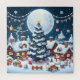 This design presents a warm Christmas village with snowy houses, a decorated tree and merry snowmen.