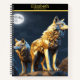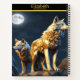 A powerful wolf stands atop rocky terrain, howling at a full moon that illuminates the night sky. Another wolf accompanies it, both conveying an aura of wild beauty and strength in this artistic portrayal created on a sketchbook.
