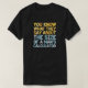 You know what they say about the size of a man's calculator... don't you? A funny geek tee for phycists or mathematicians, the design features blue and yellow text.
