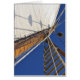 This is a colour photographic image of a mast and sail on a tail ship. The image features a yellowish brown wooden mast with a white sail and the white rope which is used to hoist the sail in the air. You can also see the vibrant blue sky and a rope ladder which extends to the top of the mast. The image was taken from the perspective of looking straight up the pole. This would make a great gift for any nautical loving sailors shoe have the sea of ocean in their blood.