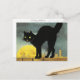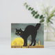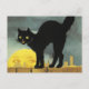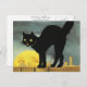 Vintage Halloween illustration showing a black cat on a fence with a moon-face behind.