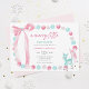 This "Merry Little Christmas" baby girl shower invitation features a festive and delicate design with a pastel colour palette of pinks, blues, and whites. A whimsical pink watercolor bow at the top left and a border of pastel baubles resembling Christmas ornaments frame the card. Two cute baby deers adorn the bottom right corner, adding a sweet, seasonal touch. The design beautifully combines Christmas cheer with a soft, welcoming vibe for a baby girl shower.