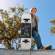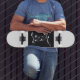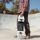 A minimalistic graphic design of a skateboarder in mid-air, using clean lines and negative space to convey a sense of movement, ideal for printing on t-shirts and posters. --ar 169 panther black