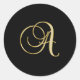 "A" Monogram Initial in gold on black. Classic Round Sticker