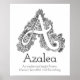 Pretty A monogram ink drawing Zen style doodle. Art name and meaning inked doodle art poster is perfect for a girls bedroom in black on white. Personalise with your child's own name beginning with A, and name meaning for a truly personalised touch to your child's bedroom or nursery, this example is for the name Azalea An exuberant bright flower, tolerant, beautiful and flourishing. Choose a the matt poster finish and you can colour it in too. © Unique A monogram drawing featuring flowers such as Azaleas, Alison, Asters, cute leaf-carrying ants and various arrows. Description original ink drawing and design by Sarah Trett. www.sarahtrett.com for www.mylittleeden.com