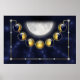 This sparkling design illustrates the lunar cycle in bright gold and deep blue. The jewels representing the moon phases run in a semi-circle from waxing crescent, to first quarter, waxing gibbous, full moon, waning gibbous, last quarter, and ending on a waning crescent. They are set against a fractal backdrop like the starry sky, with a silvery glowing moon photo from NASA to complete the piece.
