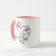 The image shows a white ceramic mug with a soft pink handle and a matching pink interior, giving it a warm and inviting aesthetic. The design on one side of the mug features a sentimental illustration of a mothers hand with six of her childrens' hands holding hers, which symbolises the bond between mother and her children. Above the hands, there is a delicate floral arrangement consisting of pink flowers with green leaves, adding an elegant and decorative touch. The hands are labelled "kid 1,2,3,4,5,6" and "Mum," reinforcing the theme of connection and care. The overall design conveys a heartfelt tribute to motherhood and the lasting relationship between a parent and child.