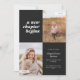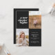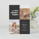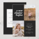 This modern graduation announcement features the words "a new chapter begins" on the top left of the card on a black background. It has spaces for two vertical photos to celebrate your graduate's journey so far, a photo from the past and a photo from the present. The front of the card has space for the graduate's name, class year, school, and future plans. The back of the card has space for additional text and can be used as a graduation party invitation or to write a personal message.
