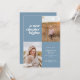 This modern graduation announcement features the words "a new chapter begins" on the top left of the card on a dusty blue background. It has spaces for two vertical photos to celebrate your graduate's journey so far, a photo from the past and a photo from the present. The front of the card has space for the graduate's name, class year, school, and future plans. The back of the card has space for additional text and can be used as a graduation party invitation or to write a personal message.