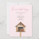 "A new chapter" baby shower theme featuring illustration of a mini neighbourhood lending library with a light pink background.