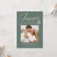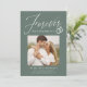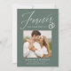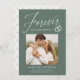 Share the news of your engagement with these elegant photo engagement announcements! The announcements feature the phrase "Forever has a nice ring to it" in a white calligraphy script accented by an illustration of wedding rings on a dark sage green background. Your square photo is displayed near the centre of the design with your names and additional details shown below. The modern engagement announcement reverses to display a white and dark sage green geometric design.