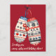 This charming Christmas postcard features a pair of cosy knitted mittens set against a rich red background. The mittens are adorned with traditional holiday motifs, including snowflakes, hearts, and trees in festive colours of white, blue, and red. Adding to the holiday spirit, two small round ornaments dangle from one of the mittens. Below the mittens, the card reads “Sending you warm wishes and holiday cheer!”