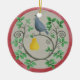 Celebrate the 12 Days of Christmas with this hand painted ornament of a partridge in a pear tree and hand lettered, “The First day of Christmas on the back. 2.87” round, this this watercolor porcelain ornament adds a touch of whimsy to a special gift or hung on a tree. One of a set of twelve scenes illustrating the traditional carol, The 12 Days of Christmas.