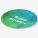 Teal, and green paper plates, happy birthday themed text can be personalised to any special event.