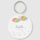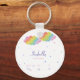 This is a personalised birth announcement button key chain with colourful designs and customisable details according to your personal preference
