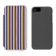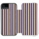 A phone case with vertical stripes in navy, yellow, and white, featuring red zigzag patterns. The folio design is shown both closed and open.