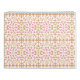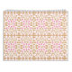 The design features a repeating pattern with floral and geometric elements. The main components include stylised flowers with eight petals, circular shapes that resemble smaller flowers or dots, and interconnected looping lines forming a lattice-like structure. The colour scheme includes shades of pink, white, and brown on a beige background. This symmetrical and harmonious design is ideal for decorative purposes such as wallpaper or textiles.