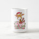 A playful giraffe wearing a bright red Santa hat, its long neck extending gracefully into the sky. The fluffy white trim of the hat contrasts with the giraffe's golden-brown patterned coat, giving a festive and whimsical touch to this majestic creature. Perfect for a holiday-themed safari scene!