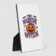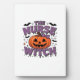 A playful design featuring a pumpkin witch with a plaque