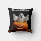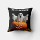 A cheerful ghost in white floats above a spooky carved pumpkin, surrounded by autumn leaves, evoking the spirit of Halloween festivities at night.