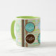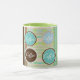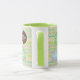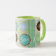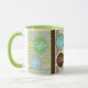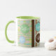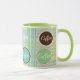 Personalize the coffee text to any name, or special word. Beautiful personalized gift idea. Colors are green, blue, white and teal with chocolate brown. Pattern is waves of color with polka-dots and stripes.