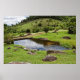 A small pond surrounded by grass and stones with a simple wooden bench for sit back and enjoy a peace moment in nature. Sky with clouds and hill in background.Mantiqueira Mountains.Sao Francisco Xavier , Sao Paulo state, Brazil. Environmental preservation area.Springtime, 2014.