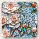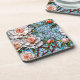 Pretty coasters with a stunning blue and pink faux mosaic floral pattern, featuring vibrant coral-coloured flowers intertwined with sage green foliage. The intricate design mimics the look of stained glass and ceramic tiles, creating an elegant and timeless aesthetic.