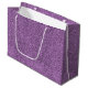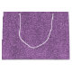 a rectangular purple glitter gift bag with a white handle and two holes punched at the top for a strap, angled to the right on a white background