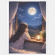 This serene illustration captures a quiet, introspective moment as a young girl gazes out of her window at the luminous full moon. The soft glow of moonlight fills the night sky, casting a calming blue hue over the distant hills and the warmly lit village below, creating a beautiful contrast between solitude and life.