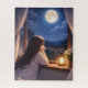 This serene illustration captures a quiet, introspective moment as a young girl gazes out of her window at the luminous full moon. The soft glow of moonlight fills the night sky, casting a calming blue hue over the distant hills and the warmly lit village below, creating a beautiful contrast between solitude and life.