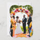 Experience the enchanting moment as an African American couple, exuding radiant smiles and tears of joy, exchange heartfelt vows under a stunning floral archway. The groom, donned in a black tuxedo, and the bride, adorned in a white wedding dress, stand surrounded by their closest friends and family. The lively atmosphere is painted with bright, joyful colours, mirroring the happiness and love shared between the couple. Seated on folding chairs along the aisle, their friends and family witness this beautiful union officiated by the minister, creating an unforgettable celebration of eternal joy