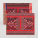 Top Section: It has a red background with black and white vertical stripes, interspersed with intricate patterns that resemble traditional or tribal designs.