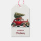 A red vintage Christmas car with a Christmas tree Gift tag.