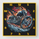 A roaring motorcycle surrounded by fiery flames square wall clock