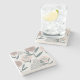 The coasters are gorgeous, a quality feel and heavy weight. They look like a precious archeological find. A rustic stone juxtaposed with a modern floral black and white print. I like the way the print goes slightly imperfect on the cut stone edges giving them a kind-of natural beauty.