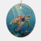 A sea turtle themed Holiday Ornament with an illustration of a sea turtle under a calm teal sea swimming among the coral on the ocean floor with sun rays beaming down on him through the aqua water. Add a coastal feeling to beachy Christmas.