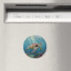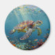 A sea turtle themed magnet with an illustration of a sea turtle under a calm teal sea swimming among the coral on the ocean floor with sun rays beaming down on him through the aqua water. Add a coastal feeling to your beach home.