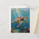 A sea turtle themed postcard with an illustration of a sea turtle under a calm teal sea swimming among the coral on the front.