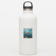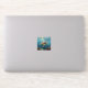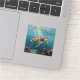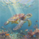 A sea turtle themed sticker with an illustration of a sea turtle under a calm teal sea swimming among the coral on the ocean floor with sun rays beaming down on him through the aqua water.