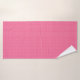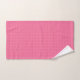 A set of pink gingham-patterned bath linens hangs on a silver bar; includes a towel, hand towel, and face cloth, exuding a fresh and vibrant tone.