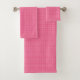A set of pink gingham-patterned bath linens hangs